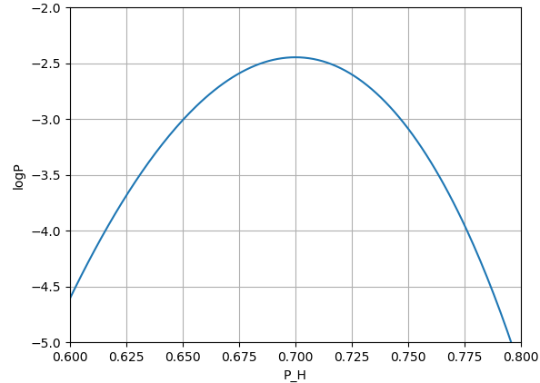 와 같습니다. $\log P(P_H)$ 함수는 $P_H = 0.7$에서 최대값을 갖고, $P_H$가 커지거나, 작아지면 함수값이 작아지게 됩니다. $P_H = 0.7$은 앞면이 나온 빈도와 동일합니다!