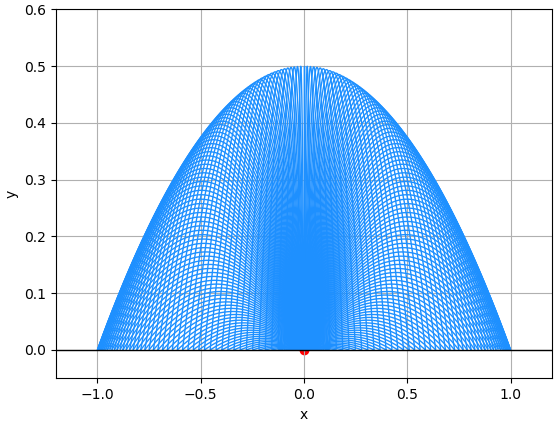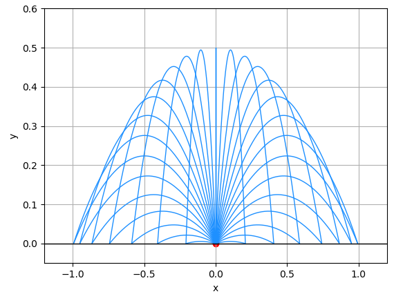 위와 같은 궤적들을 얻을 수 있습니다. 계산을 간단하게 하기 위해서 $v_0 = 1, g=1$ 의 값을 사용하였습니다.