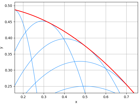 하늘색 곡선(궤적)이 2차 곡선이었는데, 하늘색 곡선들의 영역을 제한하는 붉은색 곡선 역시 2차 곡선이 얻어졌습니다. 어떻게 생각하면 당연하기도 하지만, 어떻게 생각하면 다소 신기하기도 합니다.
