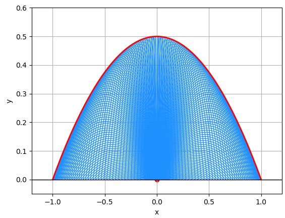 푸른색 곡선"들" 이라고 하였는데, 푸른색 곡선은 투사체의 각도 $\theta$에 따라서 그 형태가 달라지는 곡선이었습니다. 즉 $\theta$라는 일변수 파라미터에 의해서 곡선의 방정식이 주어지고, $theta$를 변화함에 따라서 비슷하지만 다른 곡선들이 얻어졌습니다. $\theta$를 0부터 $\pi$까지 변화하면서 그린 푸른색 곡선들을 둘러싸고 있는 붉은색 곡선이 바로 포락선 입니다.