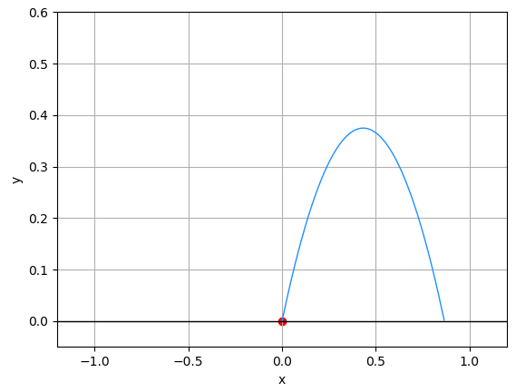 가 됩니다. 이 식에서 시간 $t$를 소거하면 $y = y(x)$와 같은 궤적을 얻을 수 있는데, 간단하게