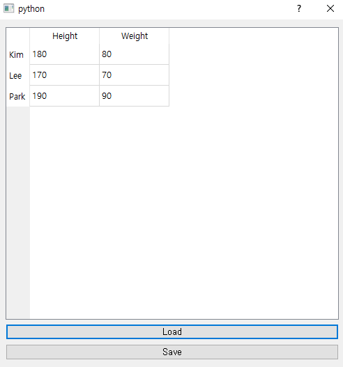 Load PushButton을 클릭하면, csv형식으로 저장 해 두었던 데이터를 Panda DataFrame의 형태로 불러오고, 이 데이터 테이블을 표를 이용하여 GUI 화면에 출력하는 것 입니다. 또한 Save PushButton을 클릭하면 표의 내용이 저장되게 됩니다. 위 표에서 내용(숫자)는 더블 클릭을 하면 수정할 수 있기 때문에, 수정 된 사항을 저장하게 되는 것 입니다.