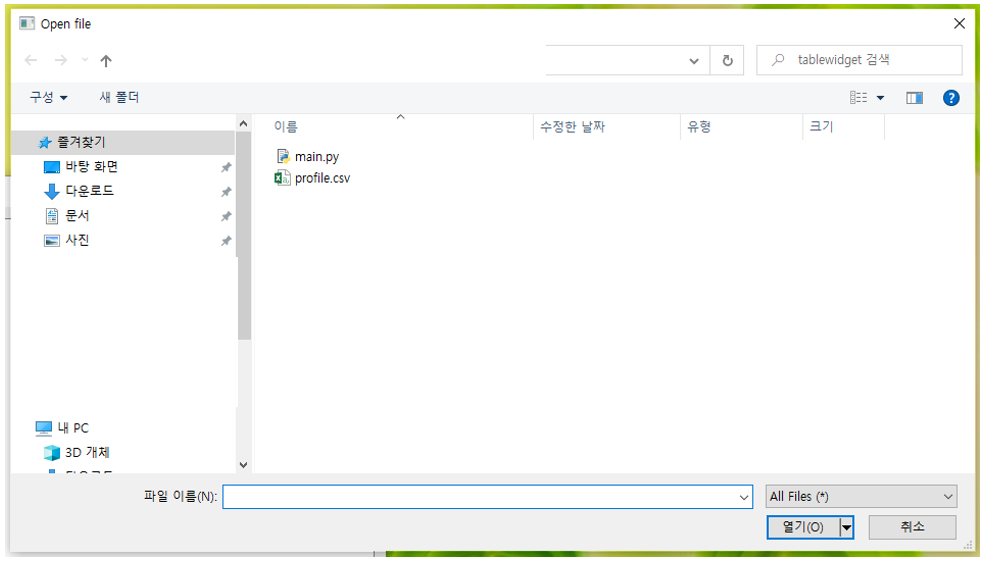 Load 버튼을 클릭하면, 어떠한 csv 파일을 QTableWidget을 통해서 디스플레이를 할 것인지 파일을 선택하는 대화창이 뜹니다.