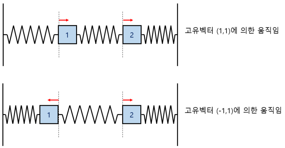 고유벡터 $(1,1)^T$과 대응되는 움직임은 두 물체가 모두 같은 방향으로 움직이는 것이며, 고유벡터 $(-1,1)^T$과 대응되는 움직임음 두 물체가 서로 다른 방향으로 움직이는 것 입니다. 고유벡터 $(1,1)^T$에 대응되는 고유값은 $1$이기 때문에, 서로 같은 방향으로 움직이는 경우의 진동수는 $1$이며, 고유벡터 $(-1,1)^T$에 해당되는 고유값은 $3$이기 때문에, 서로 다른 방향으로 움직이는 경우의 진동수는 $\sqrt{3}$ 이 됩니다.