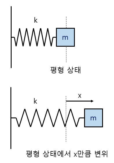 위 그림에서 처럼 질량 $m$인 물체가 용수철의 평형상태에서 $x$만큼 떨어져 있다면, 용수철이 물체에 가하는 힘은 $x$에 비례한다고 가정할 수 있습니다. 그리고 이때의 비례상수를 $k$라 놓을 수 있습니다. 따라서 뉴턴의 운동방정식은