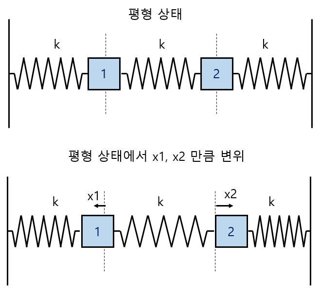 와 같이 3개의 용수철에 묶여 있는 2개의 물체의 거동입니다.
