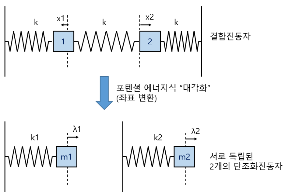 이차형식으로 주어지는 위치에너지를 행렬대각화를 통해서 완전 제곱꼴로 변환하면, 자유도 끼리의 곱해져 있는 항을 없앨 수 있고, 이를 통해서 결합진동자를 서로 독립된 단조화진동자 2개로 만들 수 있습니다. 용수철 상수 행렬의 각 고유값은 독립된 단조화진동자의 고유진동수와 관련이 있고, 고유벡터는 결합된 진동자에서 물체의 움직이는 방향과 관련이 있습니다.