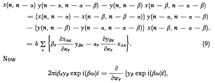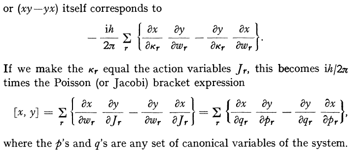 $$xy - yx = -\frac{ih}{2 \pi} \Big\{ \frac{\partial x}{\partial J} \frac{\partial y}{\partial \theta} - \frac{\partial y}{\partial J} \frac{\partial x}{\partial \omega} \Big\}$$