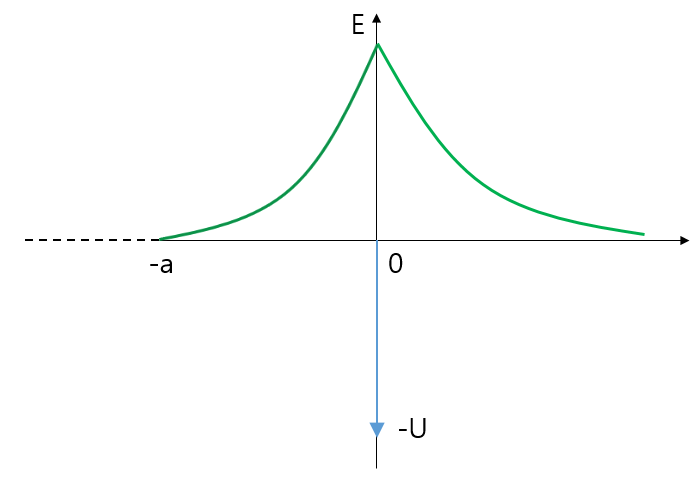 파동함수의 개형을 그리면 위와 같습니다. $x=-a$에서 파동함수는 0이 되어야 합니다. 반대로 양수쪽에서는 지수적으로 감소하고 있지만 항상 양수가 되기 때문에 $x$축과 만나지 않습니다.