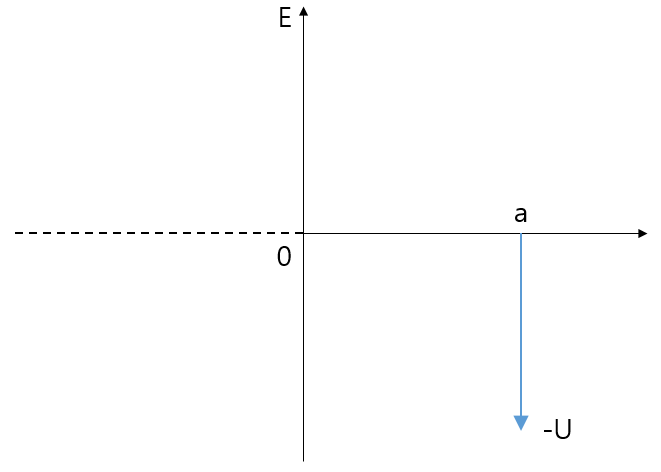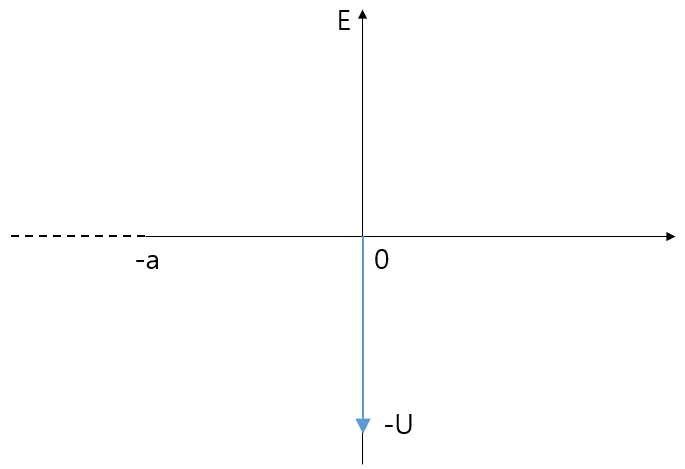 문제의 기본 조건을 그래프로 그리면 위와 같습니다. $x \lt 0$ 영역에서는 포텐셜의 크기가 무한대이기 때문에 입자의 접근이 불가능 합니다. 따라서 $x \lt 0$ 부근에는 점선으로 표시하였습니다. 입자는 $x \ge 0$ 에만 존재할 수 있으며(해당 영역에서만 파동함수의 값이 0이 아닐 수 있습니다), $x=0$에서 경계조건은 자연스럽게 $\psi(0) = 0$ 이 됩니다. 문제에서는 $U \lt 0$ 으로 하여 $V(x) = U\delta(x-a)$ 로 두었는데, 편의상 $V(x) = -U\delta(x-a)$로 변경하도록 하겠습니다. 이 경우에는 $U \gt 0$이 됩니다. 개인적인 의견이긴 하지만, 문자가 음수값을 갖는 것 보다는 양수값을 갖는 것이 식을 전개함에 있어서나 생각함에 있어서나 편리한 것 같습니다. $x \gt 0$ 에서의 특별한 경계조건은 없습니다.