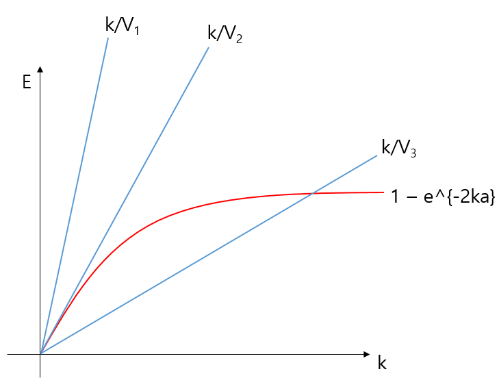 위 그래프에서 붉은선은 $1 - e^{-2ka}$를 푸른색 선은 서로 다른 $V$값에 따른 $k/V$를 나타내고 있습니다. $V$의 값이 클 수록, 즉 포텐셜의 세기가 강해질 수록, 그래프의 기울기는 작아지게 되고 큰 $k$값에서 붉은색 그래프와 만나게 됩니다. 두 그래프가 만나게 되는 $k$값이 우리가 구하려고 하던 bound state의 에너지에 대응되는 $k$값 입니다. $V$의 값이 매우 작다면, 즉 포텐셜의 세기가 매우 작다면, 푸른색 그래프의 기울기는 매우 커지게 되고, 위 그래프의 $V_1$으로 표시한 그래프와 같이 푸른색 그래프와 붉은색 그래프가 만나지 않을 수도 있습니다. 이 경우에는 bound state의 해가 없는 경우가 됩니다. 즉, attractive potential의 세기가 너무 약해서 bound state를 생성할 수 없는 경우 입니다. 위 그래프에서 $V_2$의 경우는 푸른색 그래프와 붉은색 그래프가 접점이 생기기 시작하는 시점의 $V$ 값인데, 교점이 생기기 위해서는 붉은색 그래프의 초기 기울기 보다 푸른색 그래프의 기울기가 더 작아야 합니다. 즉