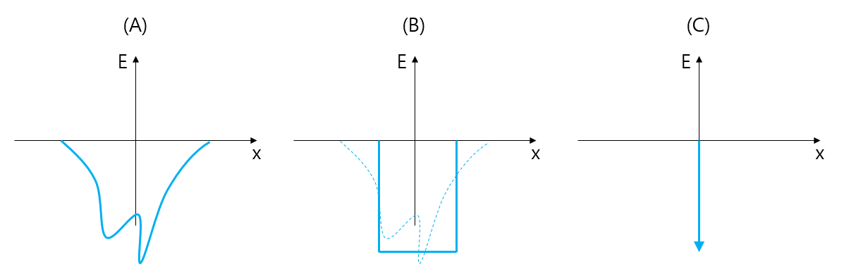 조금 더 디테일하게 설명을 하자면, 위 그림에서 (A)와 같은 형태의 포텐셜에 대한 문제를 풀고 싶다고 할 때, 바로 (A)에 대한 문제를 풀어도 되긴 하지만, 그것 보다는 매우 간단한 형태에 대해 문제를 풀어서 해당 문제에 대한 "지식"을 쌓아 두는 것이 필요합니다. 따라서 (A)를 단순화한 형태의 포텐셜이 필요한데, (B)의 형태나 (C)의 형태의 포텐셜을 생각할 수 있습니다. (B)는 깊이가 유한한 모텐셜 우물이고 (C)는 원점에 델타 함수가 있는 포텐셜 입니다. (B), (C) 모두 해석적으로 풀이가 가능하기 때문에 매우 유용한 형태의 모델 포텐셜 입니다. 문제를 쉽게 푸는 측면에서는 (B) 보다는 (C)가 더 유용한데, 왜냐하면 문제를 풀 때 (B)는 $x$축을 총 3개의 구역으로 나누어야 하고, 두 곳(포텐셜 우물의 오른쪽 왼쪽 벽 위치)에서 경계조건이 있는 문제를 풀어야 하지만, (C)는 $x$축은 2개의 구역으로 나누고, 한 곳(원점)에서 경계조건이 있는 문제가 되기 때문입니다. 이러한 이유 때문에 델타 함수는 attractive potential을 매우 간단히 모델링 하는데 사용될 수 있으며, (1차원의 경우엔) 쉽게 해석적으로 풀이할 수 있는 포텐셜이기 때문에 양자역학의 연습 문제로 많이 이용되곤 합니다.