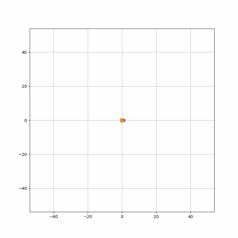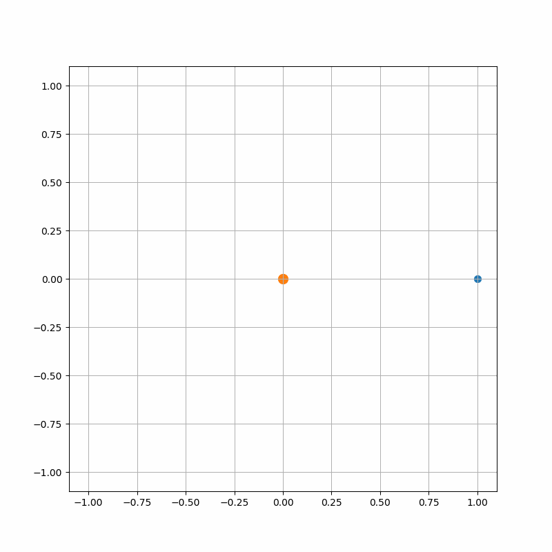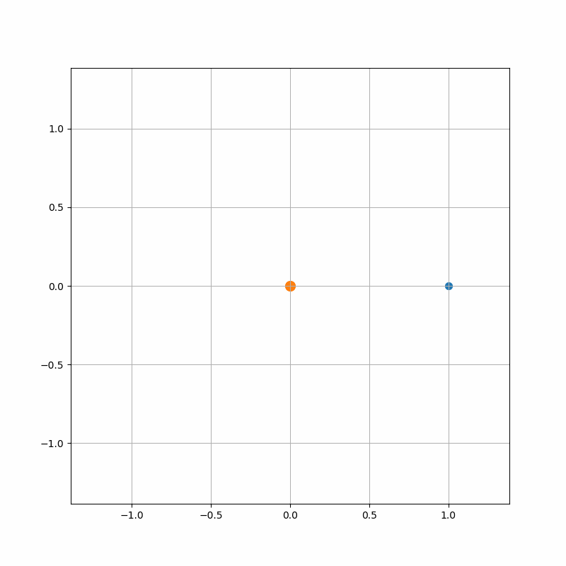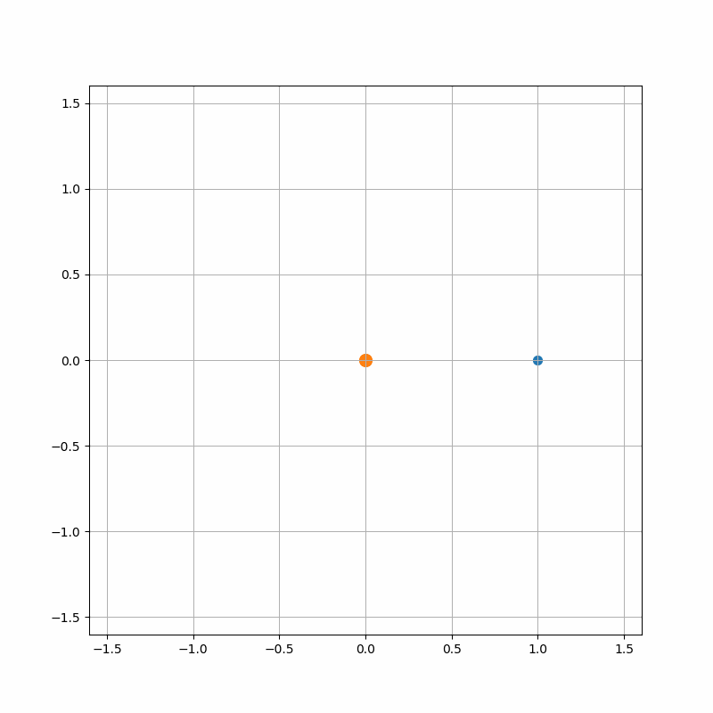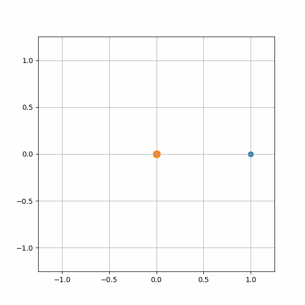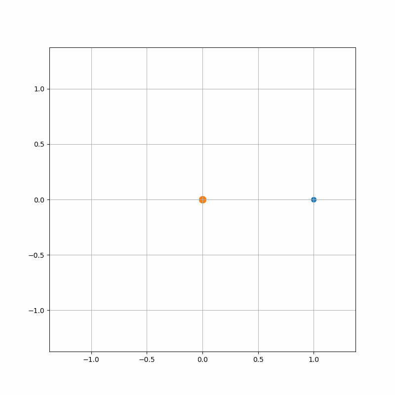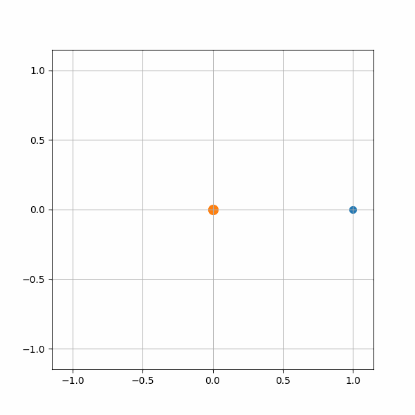 가장 간단한 원운동의 해 입니다. $x(0) = 1.0, y(0) = 0.0, v_x(0) = 0, v_y(0) = 1.0$ 입니다. 초기 위치의 원점으로 부터의 거리가 1이고, 원의 접선 방향 ($\hat\theta$) 방향의 속도가 1이기 때문에, 이 조건은 중력 = 구심력이 됩니다. 위 에니메이션에서 보는 바와 같이, 입자는 등속 원운동을 합니다.