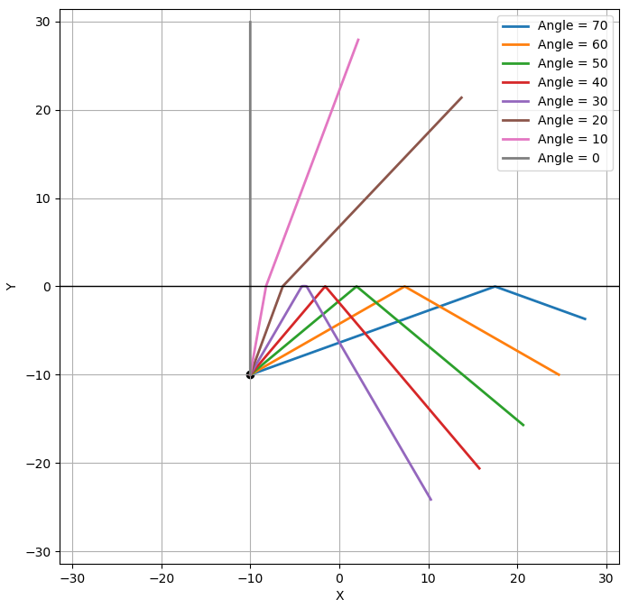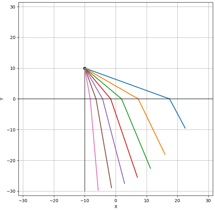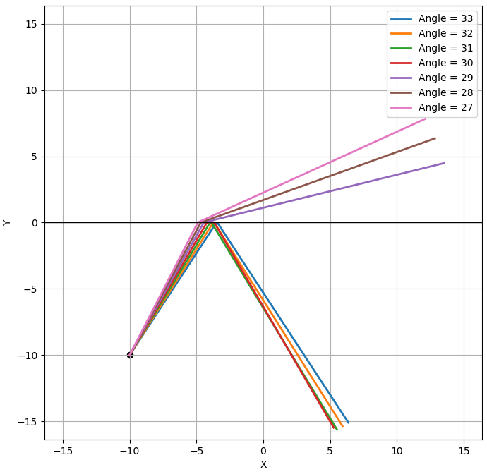 $(-10, 10)$에서 다양한 방향으로 빛이 뿜어져 나아갔다고 하면, 다음과 같은 빛의 경로가 가능합니다.