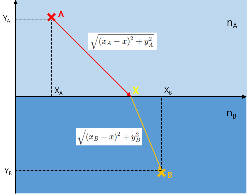 이제 $T[c(x)]$를 한 번 계산해 보겠습니다. 우선 $T[c(x)] = T[c_{AX}] + T[c_{XB}]$ 인 것은 당연하고, $T[c_{AX}] = n_A |A -X|$ 가 됩니다. 즉 단순히 $c_{AX}$ 경로상의 굴절률 $n_A$과 $c_{AX}$의 길이 $|A-X|$의 곱으로 주어집니다. $|A-X| = \sqrt{(x_A - x)^2 + y_A^2}$ 이므로, (경로 $c_{XB}$에 대해서도 동일하게 계산하면)