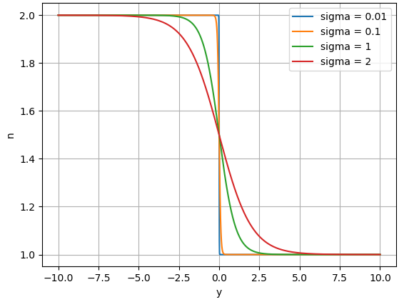 $$n(y) = \frac{n_1 - n_2}{2} \tanh \Big( \frac{y}{\sigma} \Big) + \frac{n_1 + n_2}{2}$$