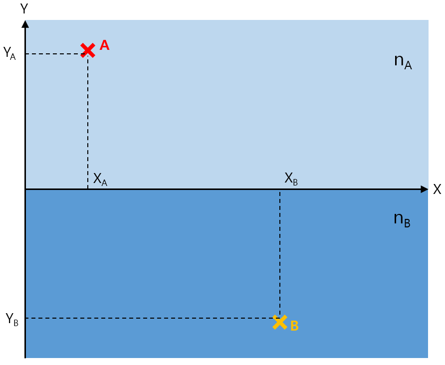로 주어진 경우를 생각하겠습니다. 편의상 $n_B \gt n_A$로 놓겠습니다. $y=0$ 평면을 기준으로 위쪽은 $n(x,y,z) = n_A$이고, 아래 부분은 $n(x,y,z) = n_B$입니다. 또한 $x_A, x_B$는 $x_A = (x_A, y_A, z_0), x_B = (x_B, y_B, z_0)$로 놓도록 하겠습니다. $x_A$가 중복되어 사용되고 있긴 한데, 먼저 나온 $x_A$는 사실 $\vec{x}_A$로 받아들여야 합니다. $x_A$가 굴절률이 $n_A$인 물질 안에 위치한 점이고, $x_B$를 굴절률이 $n_B$인 물질안에 위치한 점이라고 생각하겠습니다. 즉, $y_A \gt 0, y_B \lt 0$입니다. 편의상, $x_A$와 $x_B$의 $z$ 좌표값은 같은 값으로 놓았습니다. 이 경우, 이 문제는 3차원 문제가 아니라 $X-Y$ 평면상에서 정의된 2차원 문제로 생각할 수 있습니다.