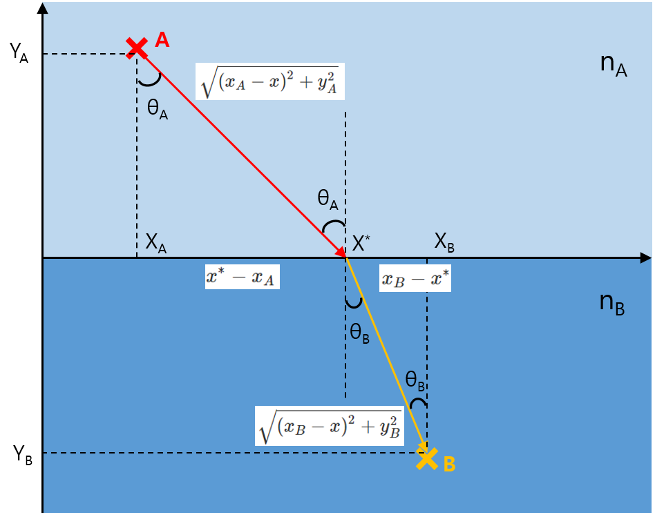 $$n_A\frac{x^*-x_A}{\sqrt{(x_A - x^*)^2 + y_A^2}} = n_B\frac{x_B- x^*}{\sqrt{(x_B - x^*)^2 + y_B^2}}$$