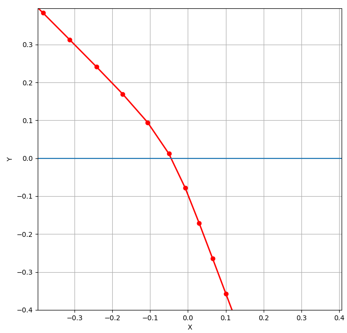 와 같습니다. 그림에서는 곡선을 그렸지만, 계산상에서 얻어지는 것은 위에서 표시한 점 입니다. 시각적 편의를 위해서 점과 점 사이를 선분으로 이은 것 입니다. 점과 점 사이의 거리는 $0.1$로 두고 계산하였습니다. 앞에서 언급한 이유 때문에, 빛는 원점 $(0,0)$에서 굴절하는 것이 아니라 그 전에 이미 굴절을 합니다.