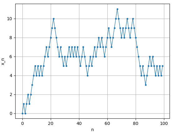 위 프로그램을 실행하면 100 스텝을 거치는 동안 얻어진 $x_n$을 그래프로 그릴 수 있습니다. 예시는 아래와 같습니다.