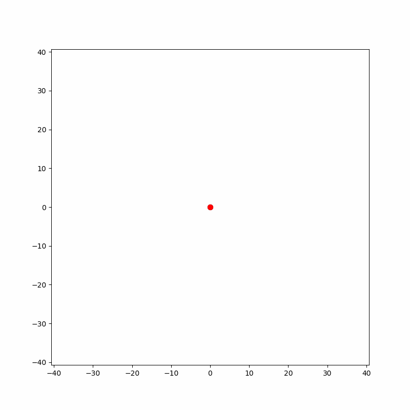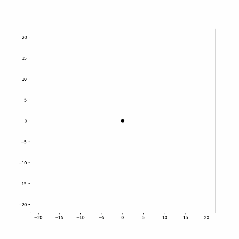 위 에니메이션은 2차원 랜덤 워크를 구현한 한 예시 입니다. 원점에서 출발하여 무작위 걸음을 하여 왼쪽 위로 움직입니다.