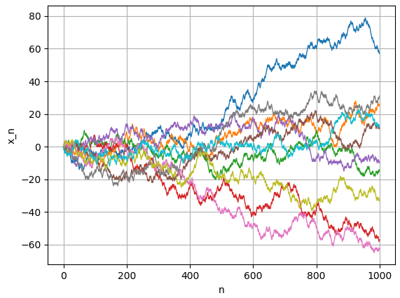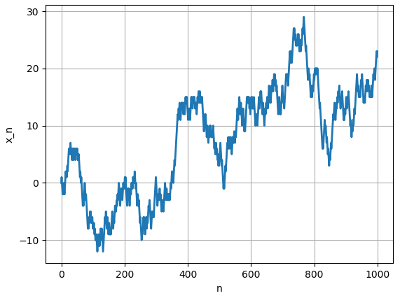 의 점화식에 의해서 수열 $x_n$이 결정 됩니다. 랜덤 워크를 설명하는 확률 변수 $r$에 대해서 생각하는 대신에 "동전을 던진 후 앞/뒤가 나오면 +1/-1 만큼 움직인다"라고도 표현을 하는데, 실질적으로 같은 것 입니다.
