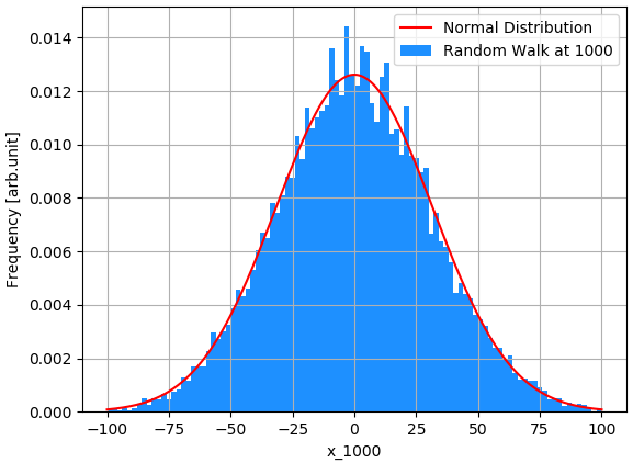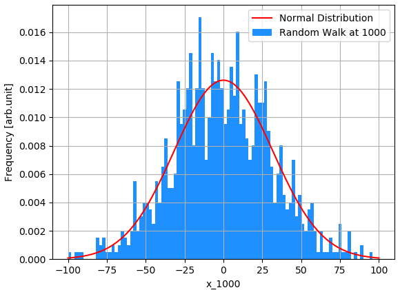 위 그래프의 푸른색 히스토그램은 랜덤 워크 1000 번을 수행하여 얻은 1000개이 $x_{1000}$의 분포를 나타낸 그래프 입니다. 그리고 붉은색 선은 평균이 $0$, 표준편차가 $\sqrt{1000}$ 인 정규 분포를 그린 것 입니다. 삐죽삐죽한 모습이 나타나긴 하지만, 전체 걔형에서 실제 랜덤 워크의 결과와 정규 분포가 유사합니다.