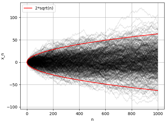 위 랜덤 워크 그래프에 $x_n = 2\sqrt{n}$를 붉은색으로 추가했습니다. 각 $n$에서 대부분의 그래프가 붉은색으로 표시한 영역안에 있고, 특히 진한 어두운색의 영역이 붉은색 그래프의 사이에 위치함을 볼 수 있습니다. (비록 구체적인 예시를 통해 추론하는 것 이니지만) 이를 통해서 랜덤 워크를 실제로 구현하면 대부분의 경우 "$|x_n| \lt 2 \sqrt{n}$이 된다" 라는 결론을 내릴 수 있습니다.