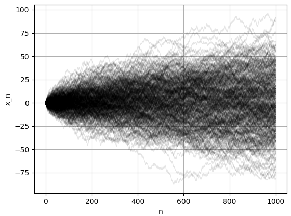 이번에는 총 400개의 $x_n, n=1, 2, ..., 1000$ 수열을 생성하여 하나의 그래프로 그렸습니다. 각 수열을 옅은 회색으로 그렸는데, 진한 검은색으로 표현되는 것은 여러 그래프가 겹쳐졌기 때문입니다. 바로 앞 문단에서 설명한 것과 같이 대부분의 경우에는 1000걸음을 갔음에도 불구하고 $x_{1000}$값은 (플러스 마이너스) 50 범위에 위치합니다. 개중에는 +100까지 멀리간 경우도 있지만 그 경우는 희박합니다.