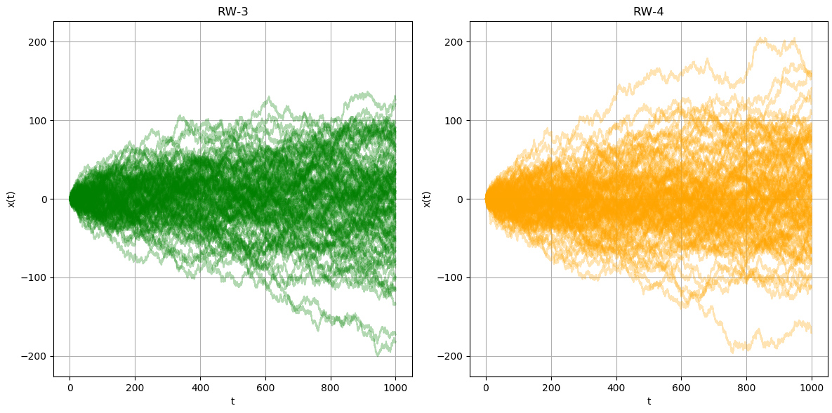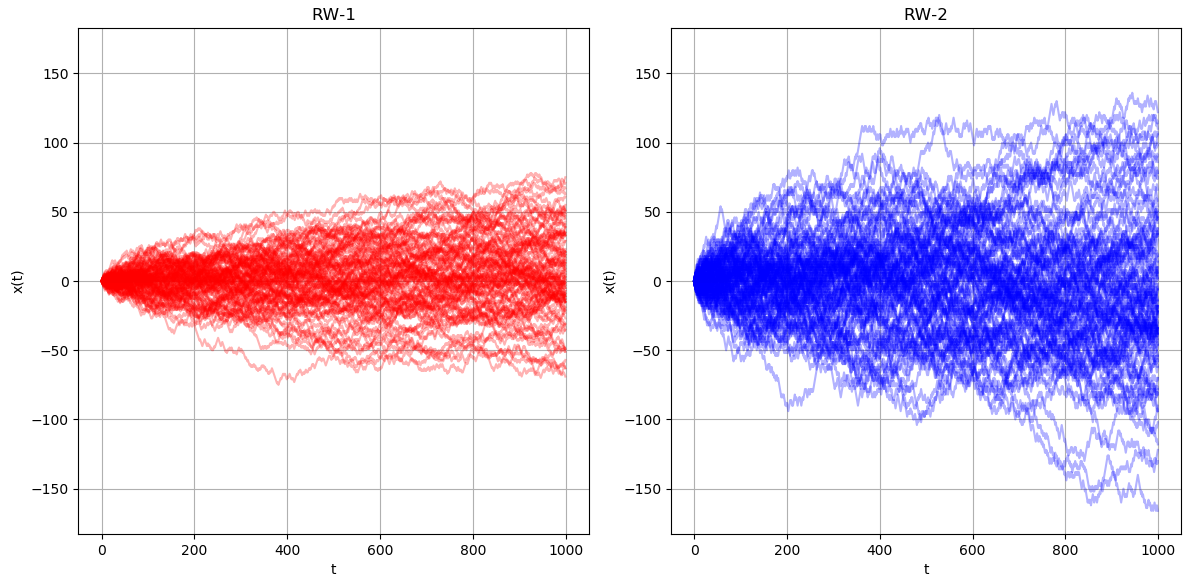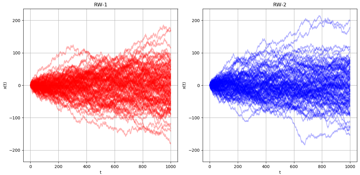 $\Delta t_1 = \Delta t_2 = 1$인 경우의 두 랜덤 워크 $x_1(t), x_2(t)$를 각각 1,000개의 경로를 생성하였습니다. 그냥 봐도 두 랜덤 워크는 "같지" 않습니다. $\Delta x_2$가 $\Delta x_1$의 $2$배를 가정하였기 때문에, $x_2(t)$의 변화의 정도가 더 큽니다. 이전 포스팅의 결과를 이용한다면, $x_2(t)$의 표준편차는 $\sigma_1 = \Delta x_2 \sqrt{\frac{t}{\Delta t}}$가 되지만, $x_1(t)$의 표준편차는 $\Delta x_1 \sqrt{\frac{t}{\Delta t}} = \frac{1}{2} \sigma_1$가 됩니다. 위 그래프를 봐도 $t = 1,000$에서 $x_1(t)$의 최대값은 대략 75 부근에 있지만, $x_2(t)$의 최대값은 대략 150 부근에 있어, $x_2(t)$가 원점에서 멀어지는 정도가 $x_1(t)$가 원점에서 멀어지는 정도의 2배가 됩니다. 한 스텝에 움직일 수 있는 거리가 2배 되었기 때문에 당연한 결과입니다.