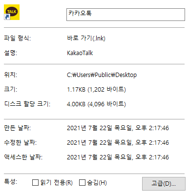 -FormLayout의 label 값은 파일 형식, 설명, 위치, 크기, 디스크 할당 크기 등이 되며, field값은 바로가기(.lnk), KakaoTalk 등이 됩니다.