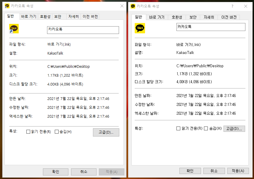 PC에 PC용 카카오톡을 설치하고 바탕화면에 생성되는 카카오톡 아이콘의 속성창을 열었습니다. 왼쪽이 바로 윈도우 기본 속성창 입니다. 오른쪽은 PyQt를 이용하여 최대한 윈도우 속성창에 비슷하게 만든 대화창(QDialog)입니다. 차이가 있긴 하지만, "거의 같다"라고 할 수 있을 정도로 유사한 대화창을 만들었습니다. 이러한 대화창을 만들기 위해서는 기본적으로 동일한 위젯과 레이아웃을 생성하여 배치하는 것도 중요하지만, 위젯과 레이아웃에 다양한 옵션을 설정하여 세세한 부분까지 유사하게 맞추는 작업이 필요합니다. 이번 포스팅에서는 위젯과 레이아웃을 꾸밀 수 있는 설정에 대해서 알아 보도록 하겠습니다. 몇몇 간단한 설정만 해 준다면, 개발을 하려고 하는 벤치마크 프로그램과 매우 유사한 형태의 UI를 만들 수 있습니다.
