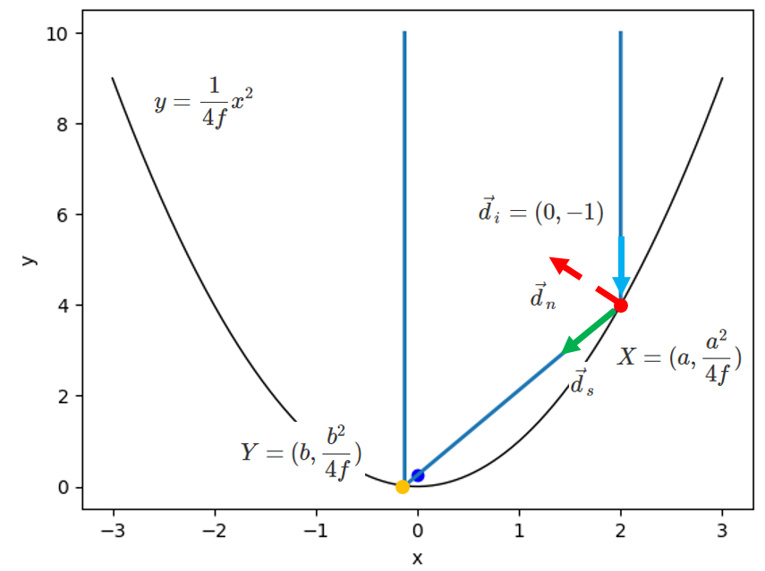위 그림에서와 같이 $x = a$ 에서 빛이 입사 했다고 하겠습니다. 입사 빛은 $y$ 축과 나란하기 때문에 $\vec{d}_n = (0, -1)$가 됩니다. $y = \infty$에서 입사한 빛은 점 $X = (a, \frac{a^2}{4f})$ 에서 반사하게 됩니다. 반사 벡터 $\vec{d}_s$를 구하기 위해서는 반사가 일어나는 지점의 법벡터 $\vec{d}_n$를 알아야 하는데, 법벡터는 점 $X$에서의 접선에 수직인 벡터가 됩니다.