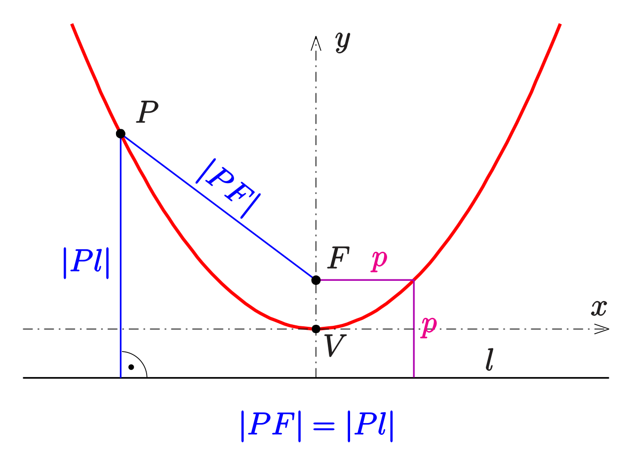 위 정의에서 한 점은 $F$이고 (이 점의 좌표를 (0, f)라 하겠습니다.), 이 점을 지나지 않는 직선은 $l$ (포물선의 정의에 따라 이 선의 $y$ 좌표는 $-f$ 입니다) 입니다. 이 직선을 보통 "준선" 이라고도 합니다. 포물선 위의 한 점을 $P$라고 한다면, 포물선의 정의에 따라서, 선분 $PF$의 길이와 선분 $Pl$의 길이가 같아야 합니다. 점 $P$의 좌표를 $(x,y)$라고 한다면,